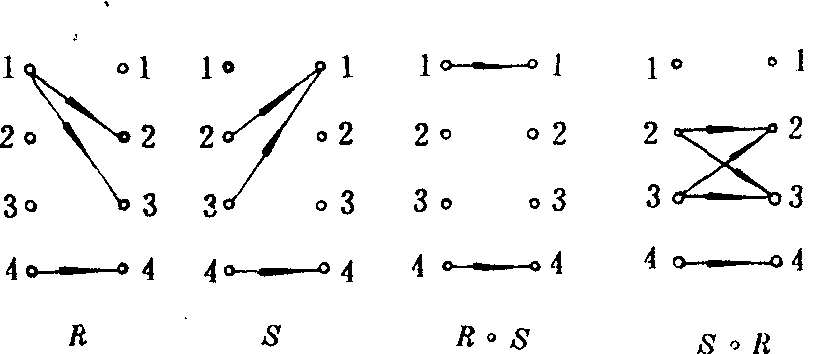 例如,设X ={1,2,3,4),R= {(1,2),(1,3)},S={(2,1)(3,1)},则R·S= {(1,1)),而S·R={(2,2),(2,3),(3,2),(3,3)}.