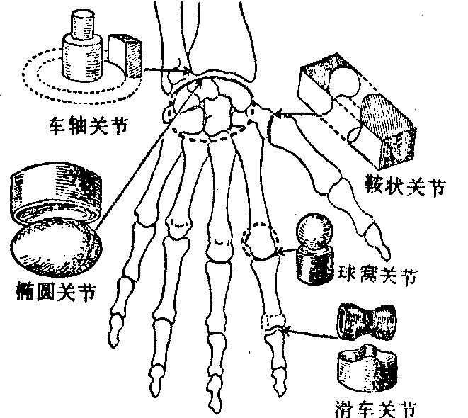 图488 关节的类型 ☚ 骨连结 上肢关节 ☛ 关节 关节guanjie骨与骨之间能活动的连接。有的骨连结不能活动,如脑颅骨的连接; 有的能稍微活动,如椎骨的连接,这些都不能称作关节。关节是骨连接的主要形式。全身各关节都由关节面、关节囊和关节腔构成(见图)。关节面是组成关节的相邻两骨的接触面、其中一个为凸面,另一个为凹面。关节面上覆盖着一层软骨,有减少两骨间摩擦和减轻两骨相撞的作用。附着在关节面周围及其附近骨面上的结缔组织为关节囊,把两骨牢固地联系起来。囊腔内表面能分泌滑液,以减少骨与骨之间的摩擦。关节囊内的空腔为关节腔,内含少量的滑液。关节腔内为负压,对维持关节的稳定性有一定的作用。关节囊的外面还有一些坚韧的韧带,把两骨更牢固地联系住。关节的这种结构,既牢固,又灵活。