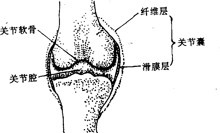 关节的构造 ☚ 骨髓 脊柱 ☛ 关节articulation又叫骨的间接连结,系骨连接的一种形式。两骨之间借结缔组织囊连结而成。这种连结较松,两骨间具有腔隙,活动范围大,可作各种灵活运动。主要见于四肢,如肩关节、髋关节等。关节由关节面、关节囊、关节腔组成。关节疾病较常见,其中以关节损伤居多,并常见有炎症等。 关节 关节Guan jie骨连接的主要形式,由两骨或更多骨连在一起,具有一定活动能力的结构。每个关节都有关节囊、关节面和关节腔。关节面为相邻两骨的接触面,多为一凸一凹,凹面称关节窝, 凸面称关节头, 两者彼此适应。关节面的表面有一层关节软骨, 可以减少摩擦和两骨撞击时的冲力; 关节囊是附着于关节面周缘和邻近骨面上的结缔组织囊, 分为内外两层,外层厚而坚韧,有的地方明显增厚为囊韧带,具有加强骨间连接,制止关节过度运动等作用,内层薄而柔软,能分泌滑液;关节腔是关节囊围成的腔,其内含少量滑液。当关节发炎时,腔内大量积液,引起关节肿胀和疼痛。关节面、关节腔和滑液使关节灵活;关节囊、韧带及附近的骨胳肌使关节牢固而稳定。