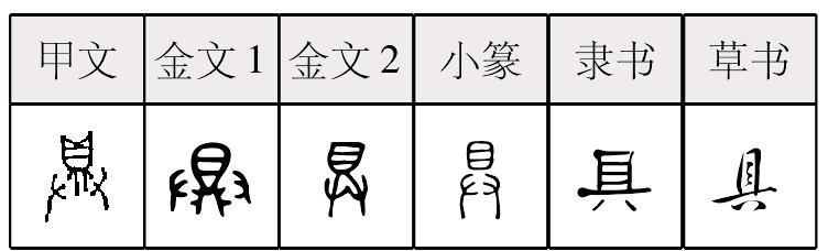 ❸ 戚戚具尔 具具,甲骨文作 ,金文作 ,小篆作 。 甲骨文从鼎从廾,“鼎” 是古代食器,雙手持鼎表示置辦食物,會意字。“鼎”或簡化爲 “貝”形,又演變爲 “目”形。本義是置辦。卜辭或用本義。銘文或用以表示器具單位,“一具”猶言“一套”。或指器具,或用作人名。又或讀 “俱”。 楚簡帛文作 ,沿襲古體。秦簡牘文作 ,古隸典型。 具jù (甲) (篆) 会意字,甲骨文为双手捧着鼎,意为准备食物,也包括盛食物的器具。故作动词有“准备”的意思,作名词有“器物”的意思。作声符生成的字有: ju 阴平:俱(姓氏) 上声:椇(枳椇,可入药) 去声:惧(畏惧) 俱(俱乐部) 飓(飓风) 犋(畜力单位)
