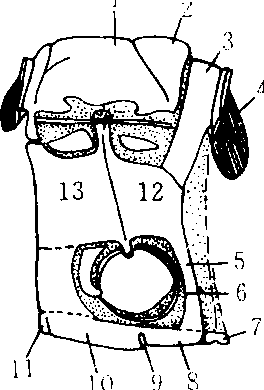 具翅胸节构造(侧面观) 1. 盾片 2. 小盾片 3. 后背片 4. 悬骨 5. 基后桥 6. 基节 7. 间腹片 8. 小腹片 9. 腹脊沟 10.基腹片 11. 前腹片 12. 后侧片 13. 前侧片 |
