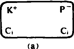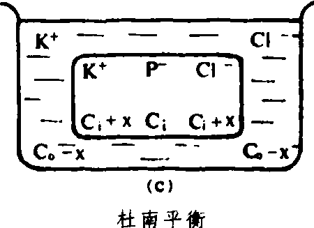 (a)细胞内有非扩散离子P-的盐类(例如为蛋白质的钾盐); (b)将细胞置KCl溶液中;(c)达杜南平衡时,K+在细胞内积累Ci细胞内的离子浓度;C0细胞外的离子浓度;x细胞外扩散到细胞内的离子浓度