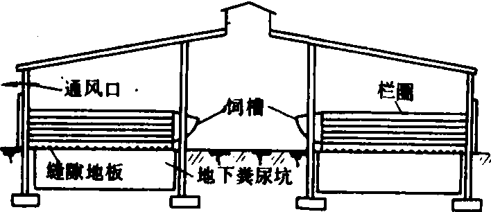 图1 羔羊育肥舍断面简图 供水设备 包括提水、贮水(水罐、贮水塔)输水管道、饮水器等部分。提水在有电源地区用离心水泵或潜水电泵;无电地区常用由风力发动机驱动的活塞泵提水。饮水设备应保证羊只能自由饮水,在围场上常用饮水槽或盆,在羊舍内则用自动饮水器,两者都采用浮子机构控制水位高低。 清粪设备 决定于栏圈的地面形式。如是干土地面,则在上面定期添加垫草,待羊群育肥结束出栏时,由铲式清粪机将粪和垫草一起清出。如是缝隙地板或金属网地面,则不用垫草,粪尿直接漏入粪尿坑内,由设在羊舍两端的粪尿泵将其定期抽入贮粪池。