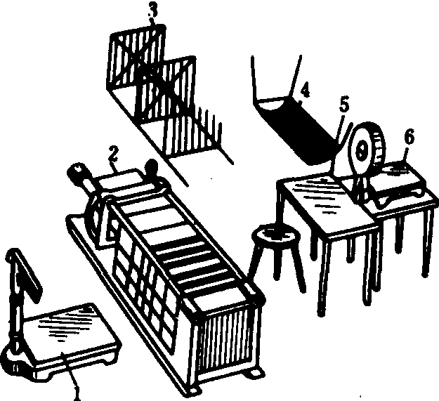 图2 剪毛间内的剪毛设备 1.毛包磅秤; 2.羊毛打包机; 3.羊毛分级箱; 4.羊毛分级台; 5.记录员工作台; 6.套毛磅秤; 7.羊毛输送带; 8.剪毛机; 9.磨刀机; 10.剪毛台 围栏 草原养羊业的基本设备。可限制放牧羊群在指定的地方采食,能有效利用草原,避免过度放牧,减少对羊群的驱赶,运行费用低,但初次投资较大(见牧围栏)。如果用电围栏,常以6伏蓄电池作为电源,通过脉冲器产生高电压,连通在栏线上。容量为20安培·小时的蓄电池能有效控制24千米长的电围栏,每充一次电可连续使用20天。放牧绵羊需用2根电围栏线,离地高度分别为300毫米和450毫米;放牧山羊需用3根栏线,相应的离地高度分别为250、500和750毫米。 剪毛设备 绵羊场的主要机械设备,包括剪羊毛机、剪毛台、套毛磅秤、羊毛分级台、羊毛打包机、毛包磅秤、磨刀机等(图2)。在无电地区还配备有发电机组。大型商品羊毛场还建有为全场绵羊集中剪毛的剪毛棚,剪毛棚内除装有全套剪毛设备外,还设有待剪毛羊群栏、生活间、羊毛存放间、剪毛机修理工作台等。 防疫设备 常应用药淋式药浴设备为绵羊消除体表寄生虫和防止疥癣病传染(见绵羊防疫设备)。 |