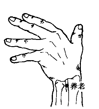 | 释义 | 养老yǎnglǎo❶赡养老人。 养老yǎnglǎo❶ 〈动〉赡养老人:养老送终︱生子养老。 养老古礼,对老而贤者按时享以酒食以敬礼之,谓之养老。《周礼·大司徒》:“以保息六养万民; 一曰慈幼,二曰养老……六曰安富。”《礼记·王制》:“凡养老,有虞氏以燕礼,夏后氏以飨礼,殷人以食礼,周人修而兼用之。五十养于乡,六十养于国,七十养于学,达于诸侯。”孔颖达疏:“皇氏云:‘人君养老有四种: 一是养三老五更;二是子孙为国难而死,王养死者父祖; 三是养致仕之老; 四是引户校年养庶人之老。’”又《礼记·文王世子》:“凡祭,与养老乞言、合语之礼,皆小乐正诏之于东序。” 养老yǎng lǎo指安度晚年:又说他父亲此时如何聘,贾琏那边如何娶,如何接了你老人家~。(六四·1565) 古代名物 > 人體類 > 四肢部 > 經穴 > 養老 養老 yǎnglǎo 手太陽小腸經穴。在尺骨小頭橈側端凹陷中。因其爲調治老人疾病的要穴,故名。主治目視不明,耳閉。始見於晉代典籍,沿稱至今。晉·皇甫謐《針灸甲乙經》卷三:“養老,手太陽郄,在手踝骨上一空,腕後一寸陷者中,刺入三分,灸三壯。”清·廖潤鴻《針灸集成·手太陽小腸經》:“養老,主治肩臂痠痛,肩欲折,臂如拔,手不能上下,目視不明。” 保养年寿 保养年寿颐年颐养天年 ☚ 保养 养气 ☛ 奉养 奉养养(侍养;引养) 供奉 另见:供养 顺从 孝敬 长辈 ☚ 奉养 奉养父母 ☛ 养老 养老养衰 颐老 ☚ 休养 调养 ☛ 养老经穴名,代号SI6。出 《针灸甲乙经》。属手太阳小肠经。手太阳郄穴。位于前臂伸侧,腕后1寸,以掌向胸时,当尺骨茎突桡侧缘上方之骨缝中。另说“阳谷后一寸五分” (《循经考穴编》广注); “去阳谷一寸二分,行向外” (《针灸集成》)。布有前臂背侧皮神经和尺神经手背支的吻合支,并有前臂骨向背侧动、静脉的末支及腕静脉网通过。主治目视不明,肩、背、肘、臂臑痛等。直刺0.5~0.8寸。艾炷灸3~5壮;或艾条灸5~10分钟 (图107)。