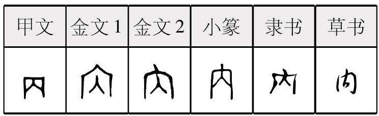 内 甲骨文; 金文; 篆nèi[冂(擬爲敞開大門的房間,意符)+入(聲符)→内(《説文》:“内,入也。從冂(jiōng),自外而入也。”内,初文像廬(入)外加圍牆,會意爲“内”。内,裏頭〈室内〉,與“外”相對。古通“納”〈收進〉,納本字。古人認爲妻主内,所以妻的親戚爲内親〈内兄、内侄〉。引申爲閨門,女色。又引申爲榫頭(入木之内。)] 《詩經·小雅·十月之交》:“仲允膳夫,棸(zōu)子内史。”(仲允掌伙食,棸子管内務。) [西晉] 陳壽《三國志·蜀志·諸葛亮傳》:“今將軍外托服從之名,而内懷猶豫之計,事急而不斷,禍至無日矣!” 内nèi(4画)