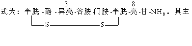 且已人工合成。有刺激ACTH及β-内啡肽等作用。但目前尚未从人的下丘脑提液中分离提纯。 此外,下丘脑还释放下列因子。 (6) 泌乳素释放抑制因子 (PIF):简称泌乳素抑制因子。能抑制泌乳素(PRL)分泌,当下丘脑有病、垂体柄切断、垂体门脉系统受压迫PIF不能下达垂体前叶或垂体移植他处时PRL增加,主要由于PIF减少或缺如所致。据近年研究可能即为多巴胺。 (7)泌乳素释放因子 (PRF): 由于促甲状腺激素释放激素 (TRH)能刺激泌乳素释放,有人曾疑及可能TRH可负责PRF的全部或部分功能。但从SS仅能抑制TSH分泌而不能抑制PRL分泌,且多巴胺强化剂 (如溴隐亭等)仅能阻抑TRH刺激PRL释放而不能减弱其刺激TSH分泌而论,则PRF与TRH并不相同,对PRL及TSH二者的刺激可分离。胰岛素诱发低血糖仅能刺激PRL,但TSH不受影响,吮吸乳头也仅能刺激PRL而TSH不增加,故PRF与TRH并非同一物。 (8) 黑素细胞刺激素释放因子(MSH. RF或MRF)及黑素细胞刺激素释放抑制因子(MSH. RIF或MIF):二者在动物实验中已有不少研究,但未成熟,且人体无垂体中叶、无黑素细胞刺激素 (MSH)细胞,故未证实有此激素。 除上述者外,尚有血管加压素和催产素,从下丘脑视神经上核及室旁核分泌后与神经垂体素结合成颗粒沿神经轴突输送至垂体后叶(即神经垂体)而贮藏于该处,随时受血浆渗透压及血容量的调节,如分娩期需要而释放入血循环。 (9) 血管加压素: 又称抗利尿激素(ADH)。主要由下丘脑视神经上核所分泌,但也有少量从室旁核分泌。其化学结构式为: