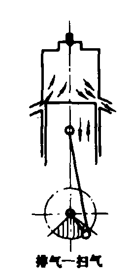 图1 四冲程工作循环示意图 图2表示二冲程工作循环的原理。它仅有压缩行程和膨胀行程交替进行。新鲜气体的供给和燃烧后废气的排出,是在活塞下止点附近分别借膨胀行程和压缩行程的一部分进行的,没有单独的进、排气行程。