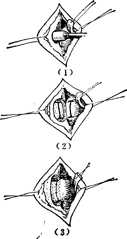 图2 右内眦韧带断裂 内眦综合损伤,包括皮肤软组织、泪道系统的创伤,和鼻泪骨的骨折。应在早期一一妥善修复。否则,至后期,除表现为内眦韧带断裂的后遗畸形外,因有泪道损伤而泪溢更为显著。且内眦部往往组织增厚,有压痛,是合并慢性泪囊炎的征象,并可出现反复发作的急性化脓性感染,或形成粘液囊肿。内眦综合损伤的后期修复包括眶窝骨壁的改造,内眦韧带的复位缝合固定。如泪小管通畅、泪囊较大或囊壁未发生破碎性损伤而鼻泪管阻塞不通时,还可试行泪囊鼻腔的造口术,以疏通泪道。其法为于内眦角内侧,近鼻根部作弧形切口,剥离并清除瘢痕组织,显露上下睑板的内侧端和内眦韧带的断端,以及眶窝骨壁。将局部骨骼修整后,在前泪嵴和泪囊槽部用环钻形成直径约15mm的骨窗。骨窗的中心应位于前泪嵴。然后经骨窗行泪囊与鼻腔粘膜间的缝合吻合术(图3)。再于后泪嵴部钻穿骨孔,以便用细不锈钢丝缝合固定内眦韧带。如泪道损伤严重已不堪修复且合并慢性泪囊炎或时有急性发作时,即应行泪囊摘除术。