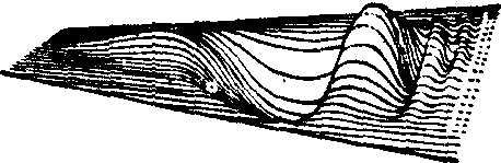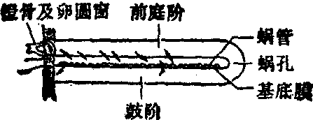 图2 螺旋器的结构 一个振动系统的共振频率(f=1/2π· )取决于它的劲度(S)与质量(M)的比值。当劲度增大则共振频率增高,质量增大则共振频率降低。由于从基底膜的底端延伸到顶端的过程中,其劲度逐减少而负载在上面的重量逐渐增加的特点,决定了基底膜的每个不同部位具有不同的共振频率,从而构成了耳蜗成为一个声波分析器的机械学基础。声波振动能量通过镫骨脚板传到外淋巴后,立即传到整个耳蜗系统。同时镫骨脚板内移时,圆窗膜外突,前庭阶与鼓阶之间形成一压力差,从而引起基底膜的振动,于是振动以波的形式沿着基底膜向前传播,这就叫行波。见图3。行波的特点是,振动在基底膜从耳蜗的底部向顶部传播时,振幅逐渐增加,而传播的速度则逐渐变慢,波长变短。当振动到达基底膜的某一部位,即其共振频率与声波频率一致的部位,振幅最大,离开该处后,振幅迅速减少,再稍远些基底膜的位移完全停止。基底膜上不同部位的振幅与声波频率有密切关系。Bekesy曾观察到行波过程中,每一种频率的声波,在基底膜不同的部位有一个相应的最大振幅部位。高频声波的最大振幅部位靠近卵圆窗,而低频声波的最大振幅部位靠近蜗顶。近卵圆窗部位的基底膜与高频声波发生共振,基底膜的中间部分与中频声波共振,耳蜗顶部的基底膜与低频声波共振。在声波的作用下,基底膜不同部位发生的位移与镫骨位移之间存在明显的相位差。离开镫骨越远则相位差越大。基底膜各部位的劲度不同,因而各个不同部位行波速度亦不一样,离开25mm处约20m/s,近顶部处速度最慢约2m/s。基底膜全长的平均速度约12m/s。