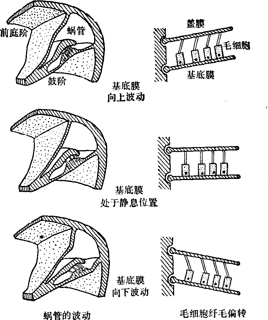 图3 行波在基底膜上的传布(示意图) 基底膜不同部位的共振频率不同,在其相应频率的声波作用下,产生一最大振幅区,该区域的毛细胞与听神经受到的刺激最强,兴奋沿不同部位的听神经纤维传到听觉中枢的不同部位,产生不同的音调感觉。这就是耳蜗对声音频率的初步分析。但仅仅依靠耳蜗的分析能力是很难达到较高的分辨水平,中枢神经系统在分辨频率的过程中起重要作用。 毛细胞的顶端镶嵌在网状板的网眼中,毛细胞中较长的纤毛穿过其顶部的表皮板而埋植在盖膜的胶冻状物质中。当行波引起基底膜向上或向下移动时,盖膜与网状板之间发生交错移行运动,两膜之间产生一种切向力,使一端埋植在盖膜中的纤毛发生弯曲,因而引起毛细胞兴奋(图4)。 关于毛细胞的功能,近年来从电镜观察到毛细胞在结构方面的特点,这对其功能的了解具有重要意义。毛细胞顶端的表皮板下面有许多线粒体、小泡及微粒等细胞器,表明该部位代谢功能旺盛。毛细胞的神经支配包括传入神经末梢和传出神经末梢两种。在毛细胞底部与神经末梢间形成突触的地方亦有大量的细胞器聚集。毛细胞的顶部与底部是细胞功能最活跃的部分,顶部可能是对机械能反应最敏感和接受刺激的地方。 鱼类侧线器官中的毛细胞具有感受低频振动的功能,是听觉器官的原始雏型,为研究振动感受器兴奋与换能过程提供了有利条件。从研究鱼类侧线器官功能所获得的资料,对说明哺乳类毛细胞的功能有重要参考意义。侧线器官中的毛细胞有静纤毛与动纤毛两类,纤毛弯曲的方向与毛细胞的兴奋与抑制过程有密切关系。生物电研究证明,当静纤毛朝向动纤毛的方向弯曲时,引起毛细胞的去极化(细胞的膜电位降低),同时传入神经冲动的发放增加,表现为兴奋效应。当静纤毛背离动纤毛弯曲时,引起毛细胞超极化(膜电位增大),同时神经冲动的发放减少。这一事实直接证明纤毛的弯曲与振动感受器的活动有着密切的联系。
