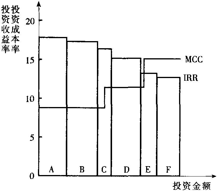 采用IRR法对投资方案进行评估,就是把计算出来的IRR与资金利息率(即资金成本)进行比较,若前者大于后者,则方案可采纳;若前者小于后者,则应放弃。当企业面对一系列具有不同IRR的投资方案(或项目)时,那么它所采纳的最后一个方案的IRR刚好超过资金成本。可用图来说明。图中横轴表示投资金额,纵轴表示投资收益率和资金成本率,A、B、C、D、E、F等长方块表示各投资方案,其高度为方案的预期收益率,连成的粗实线IRR为投资机会曲线,用它来表明各方案的收益情况,MCC曲线表示资金的边际成本(随投资的增加,筹集资金所需支出的成本也要增加),企业的投资应达到MCC曲线和IRR曲线的交点为止,最后采用的方案的收益率与资本的边际成本相等。这就是说,用内部收益率对上述方案进行评价,A、B、C、D方案应采纳,E、F方案则应放弃。 ☚ 回收期评估法 净现值评估法 ☛ |