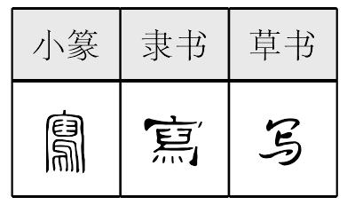写寫xiě❶ 移置,传送。《礼记·曲礼上》:“器之溉者不~,其余皆~。”《史记·秦始皇本纪》:“发北山石椁,乃~蜀、荆地材皆至。” ❷ 倾吐,舒发。《诗经·小雅·裳裳者华》:“我觏之子,我心~兮。”李白《扶风豪士歌》:“开心~意君所知。” ❸ 消除。《诗经·邶风·泉水》:“驾言出游,以~我忧。” ❹ 模仿,效仿。《淮南子·本经》:“雷震之声,可以鼓钟~也。” ❺ 描摹,描写。江淹《别赋》:“谁能摹暂离之状,~永诀之情者乎?” ❻ 抄写。《后汉书·班超传》:“为官~书,受直以养父母。” ❼ 书写。吴文英《莺啼序》:“殷勤待~,书中长恨。” 另见739页xiè。 写*寫xieD0B4 ❶用笔在纸或其他东西上画;书写:他的字~得真好/抄~/~字。 ❷创作;写作:小作家今年又~了本书/~诗/~文章/~实。 ❸绘画;描绘:~生/~真/~景/~照/速~/摹~。 模仿 模仿仿(仿像;仿模;摹仿) 拟(拟则;摸拟;棿拟;摹拟;摩拟;攀拟;准拟) 写(写放;宪写) 偩放 比(比况) 依傍(~之作) 像类 裁模 规模 规摹 法象 模敩 摹效 摹勒 陶铸 依模照样 仿照,模仿:髣髴 模仿、效法:步武(~前人) 模仿其状:拟象 模仿其法度:拟则 模仿行事或实行:仿行 照着样子模仿:照猫画虎 看猫画虎 比猫画虎 人云亦云,机械模仿:鹦鹉学舌 鹦鹉学语 因袭、模仿现成的格式:套(套用;~公式;生搬硬~) 用手势比画摹仿:比仿 暗中观察并效法模仿:窥伺效慕 单纯模仿,不加改变:依样葫芦 照样葫芦 葫芦依样 葫芦照样 依样画葫芦 生硬地模仿:生吞(~活剥) 刻板地模仿:板学 机械模仿,毫无创见:比葫画瓢 比葫芦画瓢 墨守成规,一味模仿:体规画圆 在书法上一味模仿古人,毫无创见:右军习气 追随模仿:追仿 枝附影从 追忆摹仿:追摹 因袭摹仿:袭仿 竭力模仿:酷拟 心慕手追 盲目模仿,效果很坏:东施效颦 东施捧心 西颦东效 颦效西施 捧心效颦 盲目模仿,弄巧成拙:效矉 学嚬 效颦学步 模仿得不伦不类:画虎类犬 模仿不成,弄得不伦不类:画虎不成 模仿不到家,弄得不伦不类:画虎刻鹄 画虎类狗 画虎成狗 画虎类犬 画龙刻鹄 摹仿他人不成,反而失去原有的技能:邯郸学步 邯郸学行 效步邯郸 学步邯郸 失步邯郸 寿陵葡匐 寿陵失步 寿陵学步 刻意模仿,重形不重实:描头画脚 刻意雕琢,从形式上追求模仿:画头画脚 刻意模仿而不能神似:婢作夫人 婢学夫人 善于模仿而缺乏独创:唐临晋帖 完全按原样摹仿:照模照样 拙劣的模仿:捧心 错误地模仿:枉辔学步 (照某种现成的样子学着做:模仿)