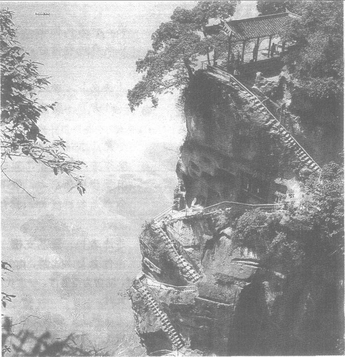 [注释] ●肩并凌云:大佛头顶与凌云山齐。●悬崖九曲:大佛右侧有凌云崖九曲栈道,沿崖迂回而下,可达江上。