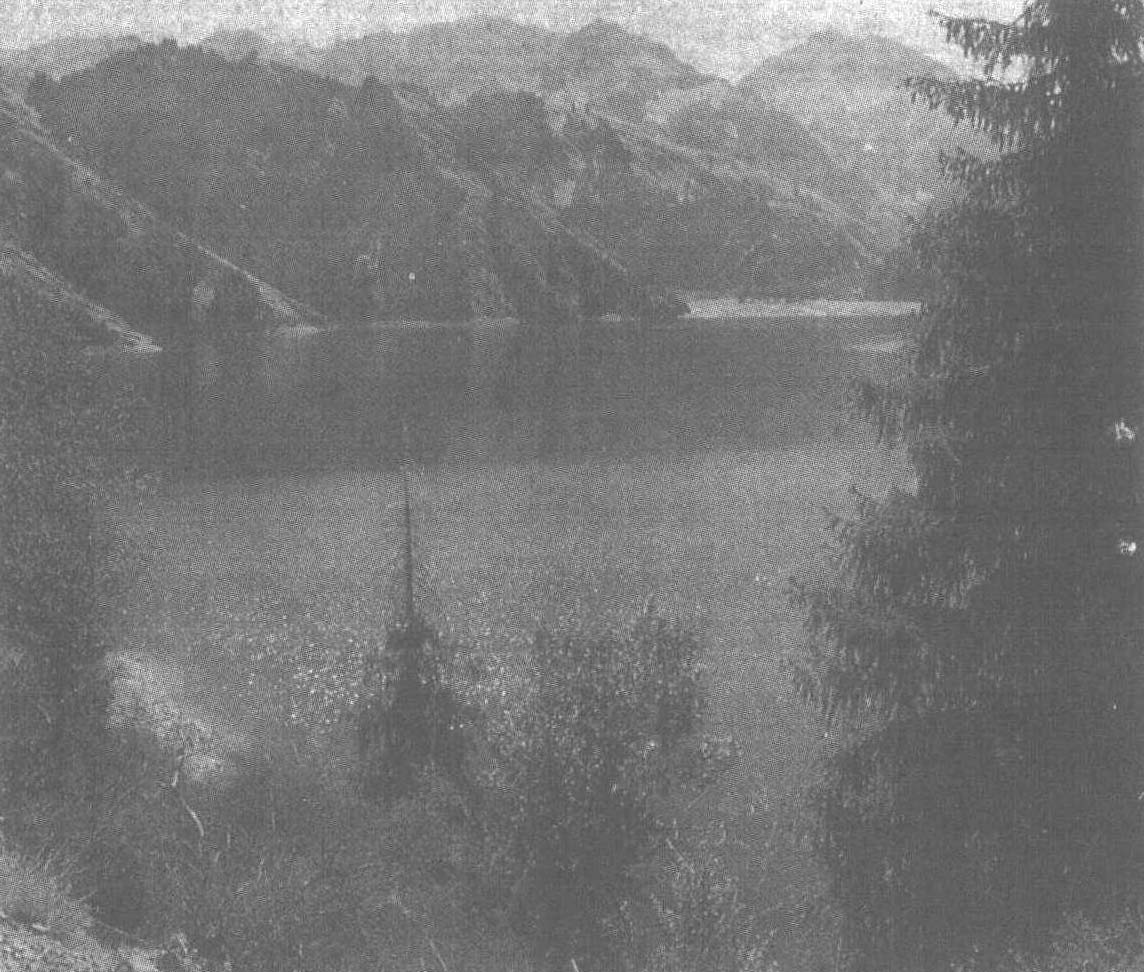 博峰高耸,远望去,但见云山皆白。曲径盘旋幽谷里,深处波平湖阔。古木参天,清风送爽,碧浪迓来客。毡包三四,岸边人戏羊突。