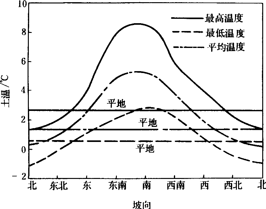 图1 北半球坡地上的可能直接辐射总量Wa与平地上的可能直接辐射总量W0的比值Wa/W0随坡向、坡度及纬度和季节的变化(曲线上的数字代表坡地的坡度) 不同方位坡地上的温度差异,主要是由辐射的差异而引起,在其他条件相似的情况下,凡是接受太阳辐射少的坡地,其温度也低;凡是接受太阳辐射多的坡地,其温度也高。因此,坡地上温度随坡向、坡度及季节和纬度而变化的规律,一般是与坡地上的辐射变化相类似,而且气候愈干燥、植被愈稀少、天气愈晴稳,不同方位之间的温度差异愈显著。但是由于不同坡地上的风速差异很大,特别是在大地形下, 云雾和降水的差异,会在不同程度上加强或减弱这种由于辐射分布特点所造成的温度差异。在中纬度地区,就相对高度差几十米到二、三百米的中等坡度的小地形来说,南坡的平均气温在冬季可比北坡高1~2℃,在夏季一般只高零点几度,东坡和西坡的温度介于南坡和北坡之间,而与平地相接近。但随着地形尺度增大,不同方位之间的温度差异也相应增大。冬季,特别是有冷平流时,南北坡地的温度可以相差好几度。坡地方位对土温的影响比对气温的影响要大得多,在冬季晴天南坡表层土壤的平均温度可比北坡高4~6℃, 比平地高3~4℃,地面最高温度南坡可比北坡高十多度,最低温度可比北坡高3~5℃(图2)。 坡地方位对湿度的影响比较复杂,对足以影响天气系统或过程的大地形来说,一般是向风坡降水多,湿度大,背风坡降水少,湿度小。但是高度不大的地形,因为对降水本身影响不大,其土壤湿度和空气湿度的相对大小主要决定于蒸发的强弱以及降水的分布和地面保水情况。所以在小地形中,坡地方位对土壤湿度的影响, 一般正好与对太阳辐射的影响相反。凡是接受太阳辐射多、温度高的坡地,因为蒸发能力强, 土壤水分消耗快,其土壤湿度一般都比较小;凡是接受太阳辐射少,温度低的坡地, 由于蒸发能力弱,土壤水分消耗慢,其土壤湿度一般都比较大。坡地方位对空气湿度的影响与气候条件有关,在气候湿润的地区,因为各种坡向土壤水分都比较充足,坡地上的蒸发主要决定于热力条件,所以接受太阳辐射多的坡地,随着蒸发到空气中的水汽多,其空气湿度也大。反之, 则小。在气候比较干燥的地区, 由于接受太阳辐射多的坡地,土壤湿度小,其蒸发能力虽强,但实际蒸发到空气中的水汽少,空气湿度就反比接受太阳辐射少,而土壤湿度较大的坡地小,特别是相对湿度在上述两种坡地上,可出现很大的差异。