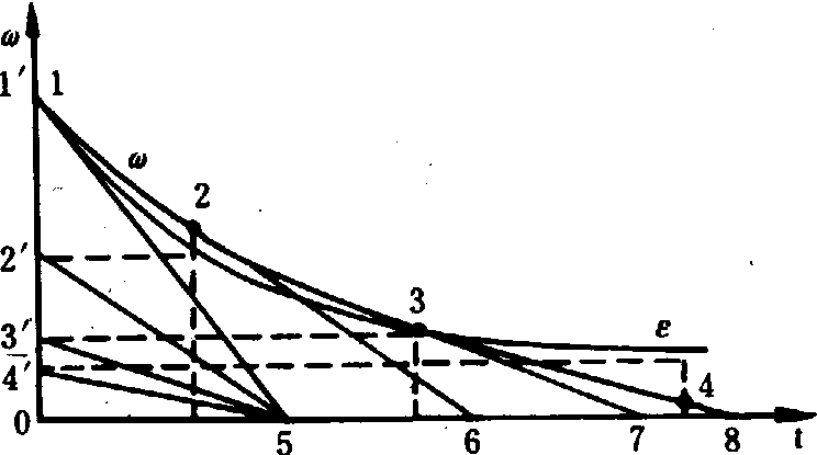 图1 生产机械启步转矩的测定 1.生产机械的拖动轴;2.绳索;3.重物;4.杠杆;5.拉力计 绘制生产机械的机械特性 生产机械的机械特性Mjm=f(ωm)是用以评价生产机械的启动条件和其拖动电动机的工作状况的。求取的方法可有以下几种: 利用经标定的直流他激电动机绘制 “标定”即要对拖动电动机进行损耗分析,测得其电枢电阻,并在保持激磁电流的条件下,测得不同转速时的空载损耗,且给出其铁损及机械损耗曲线。绘制生产机械的机械特性时,该机械由此标定的电动机拖动,使之以不同角速度(从0至1或1.1ωMN,ωMN为生产机械的额定角速度)旋转。试验中记录电枢电压Ua、电流Ia及角速度ωa。 生产机械在每一转速下的阻转矩Mjm为: Mjm=Md-MNL (2) 式中 Md为直流电动机的电磁转矩(牛·米);MNL为直流电动机的空载转矩(牛·米),MNL=C·Ia.NL,IaNL为直流机的空载电枢电流(安), C为常数, 可自直流机的空载试验求得。根据公式计算出在不同角速度下的生产机械的阻转矩, 便可绘制其机械特性。利用惯性运动曲线绘制 当拖动电动机在运转情况下,切断电源时,生产机械在运动系统的惯性作用下继续转动,待其储存的动能在克服系统旋转功率损失中消耗殆尽,生产机械遂停止,这个过程就是惯性运动过程,亦称为自制动过程。可在电动机的同轴上接装一台直流测速发电机,其电势正比于转速,以自记式伏特计在切断电源后, 记录发电机的端电压, 因端电压是与生产机械的角速度ωm相对应的, 于是可绘制惯性运动曲线ωm=f(t), 如图2, 并根据此曲线绘出ξ =dωm/dt=f (t)。