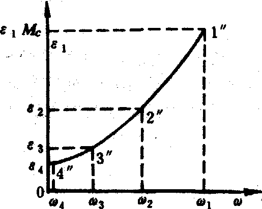图4 生产机械的空载特性 根据试验数据经计算,可绘制生产机械的空载特性,如图4所示。对于复杂的农业机械,尚需测定个别工作机构的空载特性,可由生产机械整体的空载特性减去断开该工作机构时测得的空载特性,求出该工作机构所消耗的功率及其阻转矩。 确定生产机械的惯性矩 生产机械的惯性矩指折合到电动机轴上的惯性矩,确定的方法有以下几种: 飞轮阻尼旋转法 先要选定两个具有相同质量与形状的附加飞轮,它们的惯性矩分别为J1g与J2g,为确定生产机械的惯性矩,将它们分两次装在工作机械上,作两次惯性运动试验。试验时保证机组的空载阻转矩变化规划相同。电动机切断电源(Md=0),即进入惯性运动,此时拖动运动方程为: -Mmj=(JM+Jd+Jg) (dω/dt) (6) 式中 Mmj为拖动系统的静阻转矩(牛·米);JM为折合至电动机轴上的生产机械惯性矩(千克·平方米);Jd为拖动电动机的惯性矩(千克·平方米);Jg为折合至电动机轴上的附加飞轮惯性矩(千克·平方米);ω为电动机的角速度(1/秒);t为惯性运动时间(秒)。当拖动生产机械分别带有第一个和第二个附加飞轮时,电动机转速从起始ω1至全部停止,测得拖动惯性运动时间为t1及t2。于是可得: