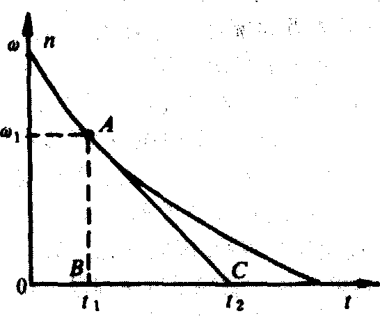 图6 惯性矩计算图(切线法) ❶切线法。在生产条件下,一般用鼠笼型异步电动机拖动,获得空载损耗特性是有困难的,可采用这种近似方法确定惯性矩。在惯性运动曲线(图6)上选A点,过A点作曲线的切线AC,△t=t2-t1=BC。制动转矩恒定下,生产机械转速从额定降至零所经历的时间为惯性运动时间。A点储存的动能为 如制动转矩不变,生产机械于t2停止,△t即惯性运动时间,此时间内的机械损耗为Pj·△t/2,Pj为生产机组的机械损耗。因此机组的惯性矩为: