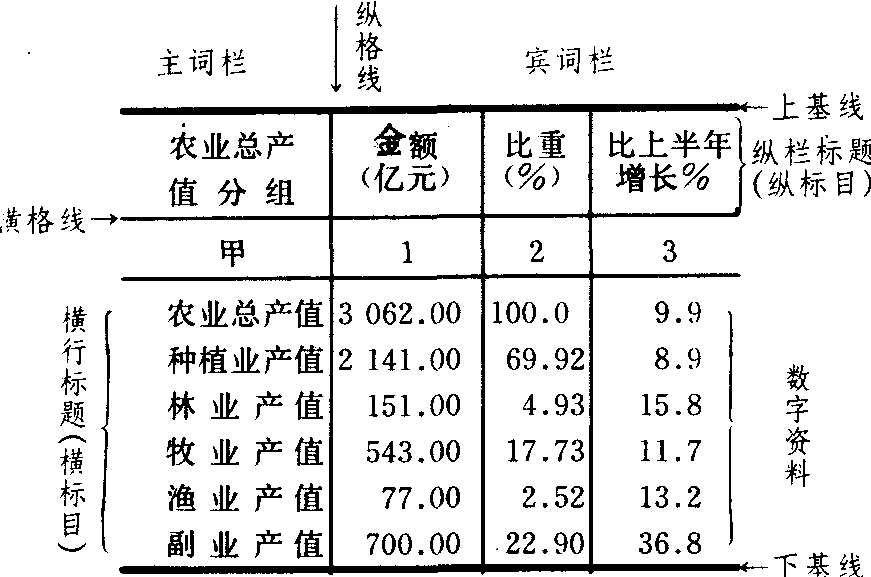 | 释义 | 农业统计表agricultural statistics in tabular form系统描述农业统计资料的表式。由总标题(时间、地点、主要内容)、横行标题、纵栏标题、格线(包括上基线、下基线、横格线、纵格线)、数字资料、表注等要素构成。按内容分为主词和宾词两部分:主词部分说明所研究的农业现象的总体及其分组, 如表1中的农业总产值及其分组;宾词部分说明总体的统计指标, 如表1中的金额、比重、比上半年增长率(%)。农业统计表的各个组成要素如表1。 表1 中国1984年农业总产值统计表
