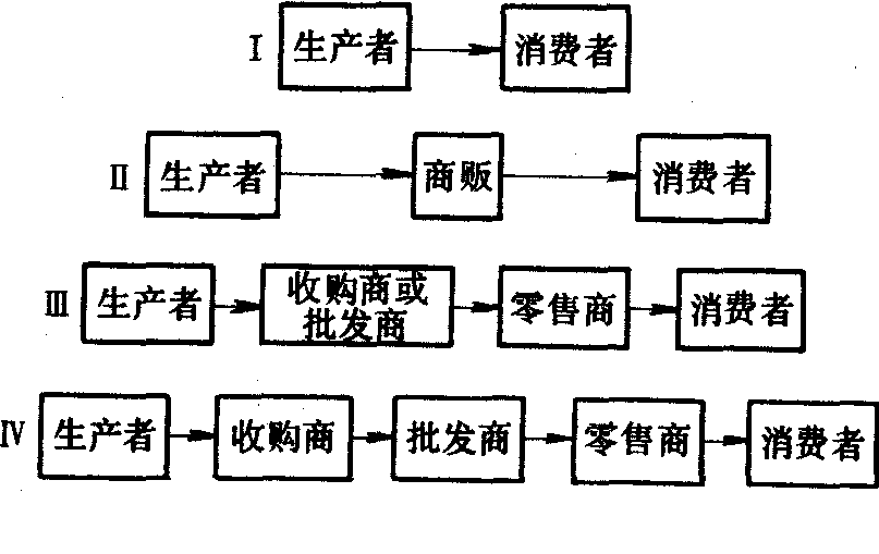 第Ⅰ类型是生产者将自己的产品经过加工或不经过加工直接销售给消费者,由消费者直接消费或进行加工后消费。 第Ⅱ类型是第Ⅰ类型的发展。由于农业商品经济的发展,出现了生产和消费之间的空间距离和时间距离,需要中间商贩来担负运销的任务。生产者生产的产品(加工或不加工)先出售给小商贩,再由小商贩(加工或不加工)销售给消费者直接消费或加工后消费。这是间接运销的初级形态。 第Ⅲ类型是第Ⅱ类型的发展。生产和消费之间的距离进一步拉长,需要收购业、批发业与零售业三种专门从事运销的行业来承担运销职能。另一个重大发展是农产品逐渐从生产者和消费者自行加工转移到流通环节中进行加工。 第Ⅳ类型是销售渠道的进一步发展。随着运销数量的大增,生产和消费之间的距离拉得更远,加工程度大大提高,而且主要集中于批发贸易阶段。生产者和消费者不再自行加工产品;零售商和收购商的加工也大大减少了。批发贸易商又分解为收购批发商、中间批发商等各个批发环节的批发商。 此外,不同种类的农产品可以有相同的销售渠道,也可以有不同的销售渠道。一种农产品可以通过若干不同途径,从生产者手里到达消费者手里;另一种农产品,只需要单一或少数的途径,从生产者手里到达消费者手里。一种农产品可以全部或一部分是直接运销;另一部分是间接运销。一种农产品可以少环节流通:另一种农产品则需要多环节流通。这都是由农产品商品运动的内在特点决定的(图2)。