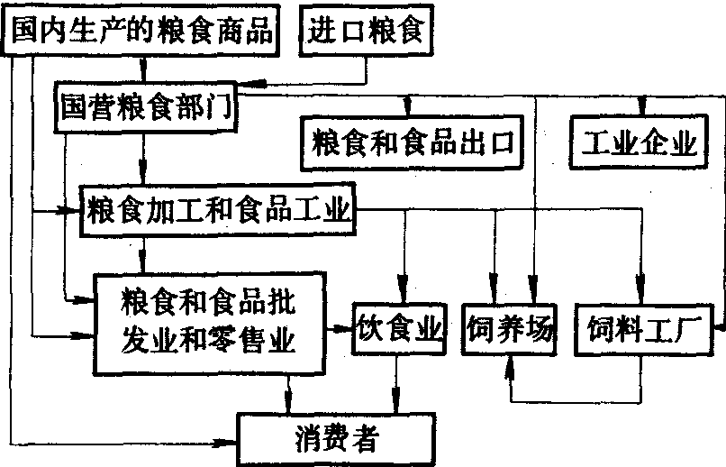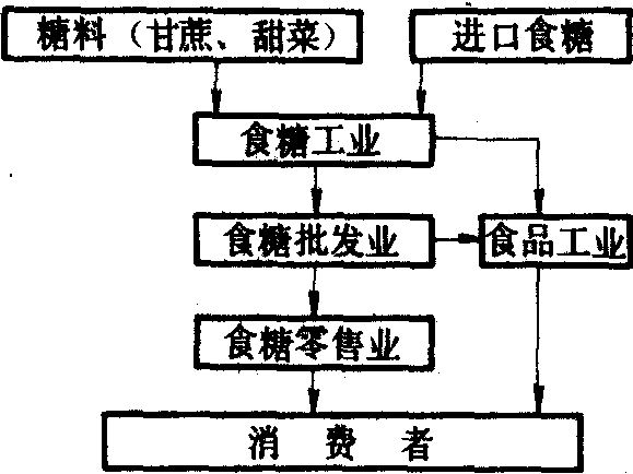 图2 中国粮食销售渠道示意图 中国商品粮食主要是由国营粮食部门收购和进口,再由它批发和零售给加工企业、消费单位和消费者个人。但是加工工业,食品工业,饲料工业以及粮食批发、零售业,也分别直接从粮食生产者那里购买粮食。粮食生产者也将自己的产品直接或通过小商贩销售给消费者。所以,粮食销售是多渠道的,主要是间接销售,也有一部分直接销售。 中国糖料销售渠道是单一的,而且是由生产单位和进口企业直接销售给食糖工业(图3)。