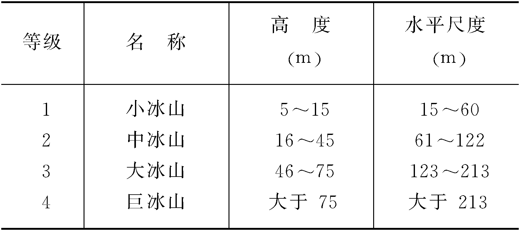 根据海洋中冰山的大小,可将冰山分为4个等级。冰山的等级取决于冰山浮在海水中露出水面的高度及其水平尺度的大小,详见下表。