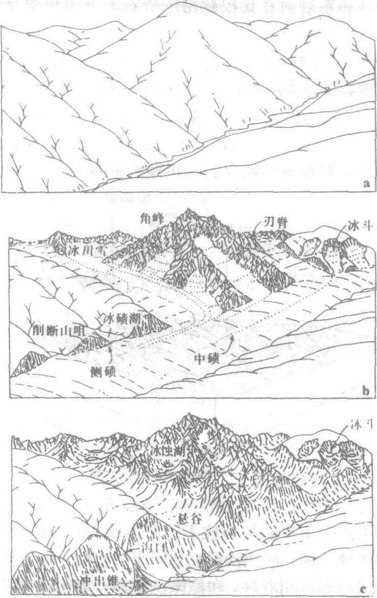 图1 冰期前后的地形演变 a:冰期前地形(圆浑山脊与V形峡谷)b:冰川作用时期 c:冰后期