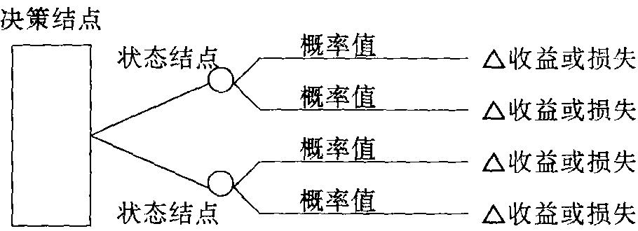 点2:0.7×100×10年+0.3×(-20)×10年-300(大厂的投资数)=340万元。 点3:0.7×40×10年+0.3×10×10年-160(小厂的投资数)=150万元。 两者相比,建大厂的方案最优。 决策树见“决策学”中的“决策树”。 决策树见“决策学”中的“决策树”。 决策树 决策树决策树是决策术中的一种。其方法是将方案的一连串因素,按他们的相互关系,用树形图表示出来,再按决策的原则和程序进行选优决策。决策树模型用下列三种符号表示:“口”表示决策结点,从结点可以划出树形支线。“O”表示决策变点,变点也就是改变结点,使结点延伸到树形的下一层次。“△”表示决策终点,即方案中的这一因素到此终结,不能再划出支线。通过这些符号,将方案的情况绘制成树形图,然后再通过数计算,比较各种方案的优劣及时找到决策的答案。决策树能使问题形象化,各种更替方案、各种出现的状态、其可能性大小及产生的后果,都可绘制在一张图表上,一目了然,对集体讨论决策提供了很大方便。 ☚ 决策矩阵 预测与决策 ☛ 决策树 决策树决策树是决策术中的一种。其方法是将方案的一连串因素,按它们的相互关系,用树形图表示出来,再按决策的原则和程序进行选优决策。决策树模型用下列三种符号表示:“口”表示决策结点,从结点可以划出树形支线。“0”表示决策变点,变点也就是改变结点,使结点延伸到树形的下一层次。“△”表示决策终点,即方案中的这一因素到此终结,不能再划出支线。通过这些符号,将方案的情况绘制成树形图,然后再通过数计算,比较各种方案的优劣及时找到决策的答案。决策树能使问题形象化,各种更替方案、各种出现的状态、其可能性大小及产生的后果,都可绘制在一张图表上,一目了然,对集体讨论决策提供了很大方便。 ☚ 决策矩阵 预测与决策 ☛ 决策树是一种向决策人提供关于系列性的决策问题的情报和数据的图形,因其形状如树,故称为决策树。所谓系列性决策问题,是指在原始决策问题之后,还要结合考虑后继的决策问题。决策树的一般形状如下图: