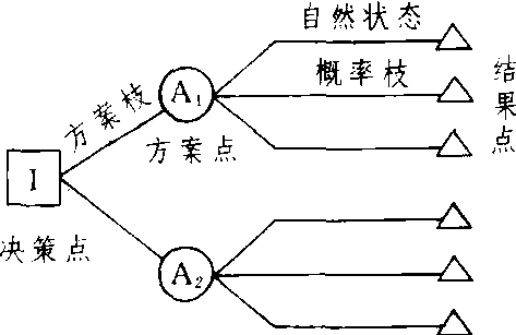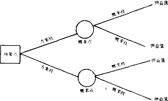 | 释义 | 决策树juécèshù根据各种可能设计多种方案,以比较选择从而提高决策效果的一种方法。例如:“现代化决策方案的拟定,要用科学的方法。一般常用的是‘决策树’等方法。‘决策树’,是指有不同种方案,每种方案又会有几种可能出现的情况,因而会产生各种不同的决策效果。就像一棵树生出几个树杈,每个树杈又生出几个枝梢一样。运用此法,可以使决策人员以科学的推理步骤去周密思考各有关因素,把未来的可能发生的事件展开,比较事件发展动态,通过数字计算,使方案更加接近实际。”(《经济日报》1983.8.6) 决策树decision tree表示决策方案与有关因素之间相互关系的由左向右横向展开的树形图。通过计算,可以在图上进行决策,决策树的基本图形如右。决策树图画成后,可从结果点开始,从右向左顺序计算出各个方案的损益期望值〔即∑(结果点损益值X概率)〕,写在方案点上方。比较各方案期望值的大小,从中选出最佳方案,并将其期望值写在决策点上方,表示决策结果。同时在淘汰方案的方案枝上划上双截线(艹),表示剪去不用。如决策问题属多阶段的,可从右向左逐步剪枝。决策树方法比较直观灵活,便于决策者集体讨论研究,广泛应用于多阶段动态决策。