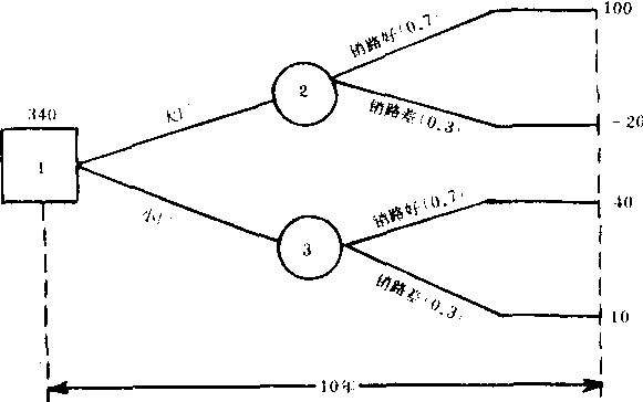 例如:为生产某产品而设计了两个基建方案,一是建设大厂需投资300万元。一是建设小厂需投资160万元。两厂的使用期均为10年,估计在此期间,产品销路好的可能性是0.7,销路差的可能性是0.3,两个方案的年度损益值如下表: