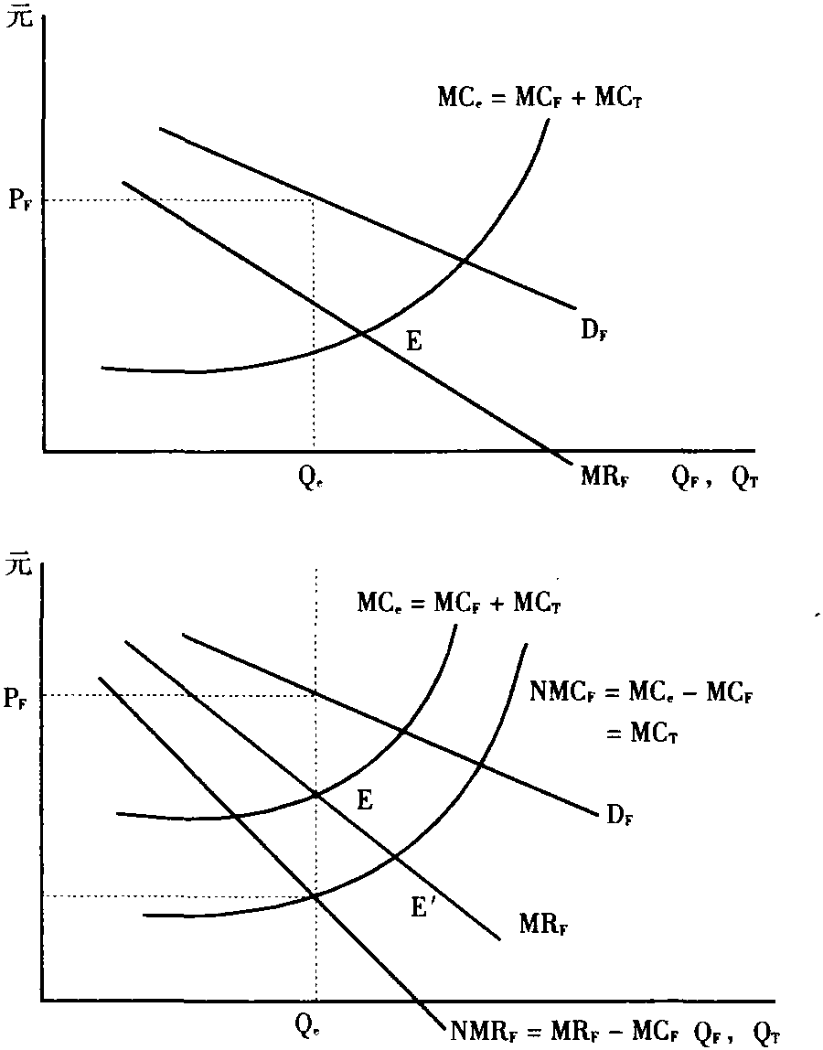 如果企业从销售最终产品中获得外部收益,且最终产品的需求曲线DF具有负斜率,MRF为边际收益,那么该企业要使利润最大,就要达到MCe=MRF的产量水平。如图所示,Qe为能实现最大利润的中间产品和最终产品的产量水平。 因为MCe=MCF+MCT,所以利润最大化的条件成为MRF=MCF+MCT,从等式两边减去MCF,就得到: