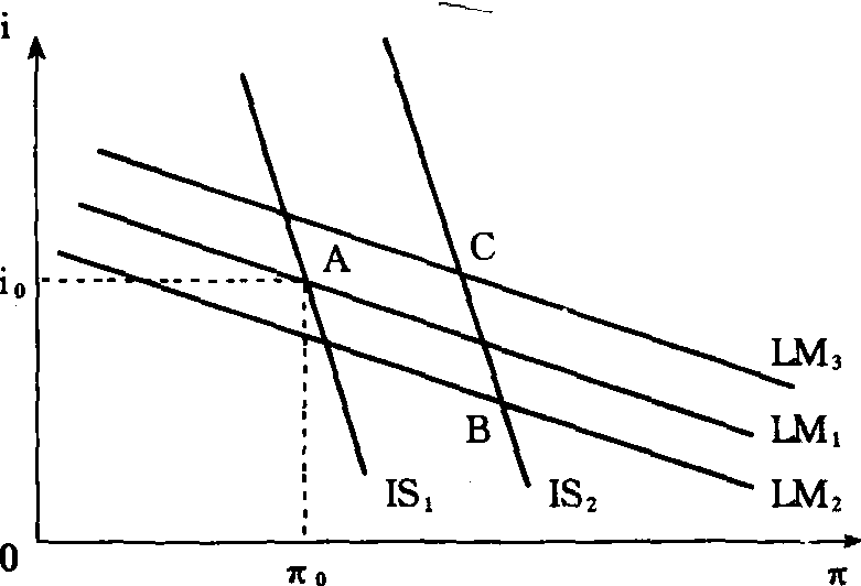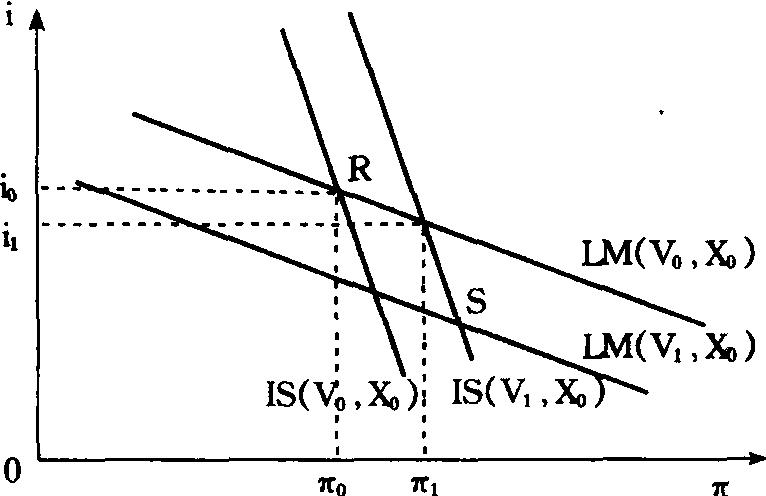 图16-18 图16-18中的直线LM则代表当x、v、和θ不变时,i与π的组合,该组合满足(12)式。由于π的上升导致了资本的预期名义收益率r(x)+g(π)和债券的名义利率i+g(π)的上升;用实物资本和债券是货币的替代品,故实际余额的需求就会减少。通过市场机制的作用,实际利率必然下降,以维持实际余额供需间的平衡。因此,i与π的运动方向仍然是互逆的,这说明LM直线的斜率仍然为负。 斯泰因根据上述IS和LM曲线检验了v的变化对π和i的影响,并得出结论:在x不变的情况下,v的增加将使IS曲线向上移动,LM曲线向下移动。从图16-18看,当v从v0上升到v1时,IS曲线从(v0,x0)上升到(v1,x0),而LM曲线则从(v0,x0)下降到(v1,x0)。IS曲线和LM曲线所表明的v的变化对π和i的影响的结果是完全相反的。那么,v的变化对π和i的影响究竟如何呢?这就要看两条曲线的斜率的相对大小了。如果LM线的斜率较大(如图16-18所示),当v从v0增加到v1时,i就会自i0降至i1,而π则会从π0上升到π1;反之,若IS线的斜率较大,v的增加就会使i上升,π下降。 斯泰因还根据IS和LM曲线检验了x的变化对π和i的影响。对于IS曲线来说,在v不变的情况下,若x上升,资本的边际产出r(x)和资本的平均产出y(x)都会提高。根据(10)式,意愿储蓄和意愿投资将由此而分别增加s1y′(x)和r′(x)。这时,如果投资的增加大于储蓄的增加,即r(x)>s1y(x),π就会上升(假定i不变);反之,如果r(x)