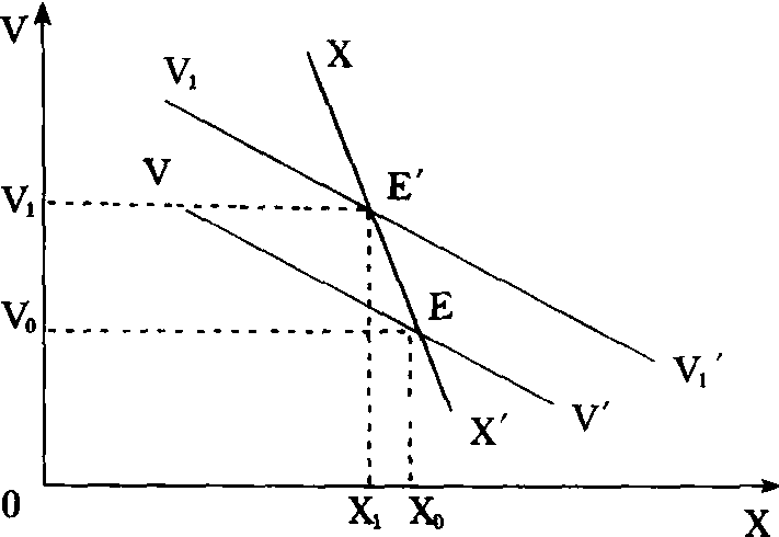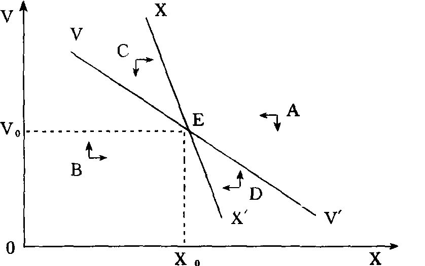 图16-20 斯泰因认为,如果经济偏离XX′线或VV′线的轨迹,就会有一些力量使它重新回到这一轨迹中。如图16-20所示,如果储蓄与投资的均衡点脱离了XX′线,而处在A、B、C、D的任何一点上,则x将沿着横向箭头朝XX′线移动。这是因为,由x的变化而引起的资本边际产出的变化大于利率的变化。当x处于XX′线的右边(如D点)时,若v保持不变,资本投资的增加就会超过劳动力的增加,x也就趋于下降,而向XX′线靠拢;当x处于XX′线的左边(如C点时),情况正好相反。同样,一旦实际余额的供给和需求的均衡点脱离了VV′线而处在A、B、C、D的任何一点上,v就会沿着纵向箭头朝VV′线移动。这是因为,当v上升而超过VV′线时,若x不变,利率就会下降,物价就会上升。随着资本收益的相对提高,资本存量将增加。由于v是货币与资本之比,资本增加就意味着v的下降。反之,当v下降而低于VV′线时,情况正好相反。 斯泰因沿袭希克斯—汉森的IS—LM分析,认为只有XX′线和VV′线的交点(如图16-20中的E点)才是经济的长期均衡点。而如果经济在长期中趋于均衡点E,VV′线的斜率就一定大于XX′线的斜率(如图16-20所示)。换句话说,经济稳定必须满足下列不等式: