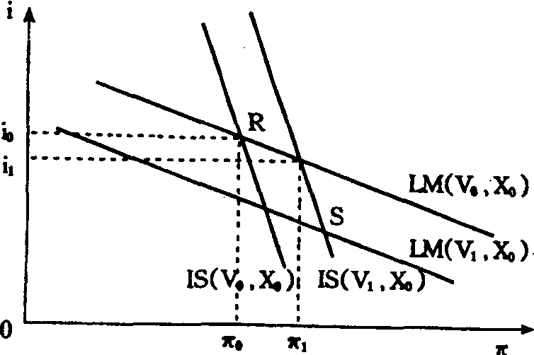 图中的直线LM则代表当x、v和θ不变时,i与π的组合,该组合满足 (12)式。由于π的上升导致了资本的预期名义收益率r (x) +g(π) 和债券的名义利率i+g(π)的上升; 用实物资本和债券是货币的替代品,故实际余额的需求就会减少。通过市场机制的作用,实际利率必然下降,以维持实际余额供需间的平衡。因此,i与π的运动方向仍然是互逆的,这说明LM直线的斜率仍然为负。 斯泰因根据上述IS和LM曲线检验了v的变化对π和i的影响,并得出结论: 在x不变的情况下,v的增加将使IS曲线向上移动,LM曲线向下移动。从图中看,当v从v0上升到v1时,IS曲线从 (v0,x0)上升到 (v1,x0),而LM曲线则从(v0,x0)下降到 (v1,x0)。IS曲线和LM曲线所表明的v的变化对π和i的影响的结果是完全相反的。那么,v的变化对π和i的影响究竟如何呢?这就要看两条曲线的斜率的相对大小了。如果LM线的斜率较大 (如图所示),当v从v0增加到v1时,i就会自i0降至i1,而π则会从π0上升到π1; 反之,若IS线的斜率较大,v的增加就会使i上升,π下降。 期泰因还根据IS和LM曲线检验了x的变化对π和i的影响。对于IS曲线来说,在v不变的情况下,若x上升,资本的边际产出r (x) 和资本的平均产出y(x) 都会提高。根据 (10) 式,意愿储蓄和意愿投资将由此而分别增加s1y′ (x) 和r′ (x)。这时,如果投资的增加大于储蓄的增加,即r′ (x)) s1y′ (x),π就会上升(假定i不变); 反之,如果r′ (x)