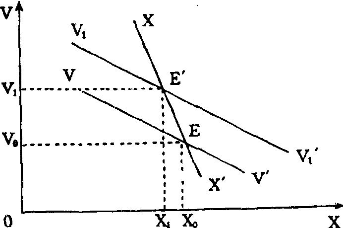 斯泰因沿袭希克斯一汉森的IS-LM分析,认为只有XX′线和VV′线的交点(如图中的E点) 才是经济的长期均衡点。而如果经济在长期中趋于均衡点E,VV′线的斜率就一定大于XX′线的斜率(如图所示)。换句话说,经济稳定必须满足下列不等式:
