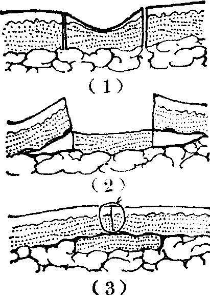 图1 左颊部的凹陷瘢痕 凹陷瘢痕如为面积较小较浅者,可用局部瘢痕组织充垫法治疗。即只将瘢痕的表皮削除,保留其深层组织以供充垫凹陷之需。然后充分剥离两侧皮下组织,将创口直接缝合。凹陷即可消失,外观得以改善(图2)。如为面积较小但较深的凹陷瘢痕,则须视所在部位,采用局部脂肪瓣或肌瓣的移转,或真皮、脂肪、筋膜、软骨、骨组织的游离移植,或组织代用品的植入等方法,才能将凹陷完全充垫平整。切除瘢痕后的创面,于游离创缘后直接缝合。如为面积较大且较深的凹陷瘢痕,切除瘢痕后的创口不能直接缝合时,则需行皮瓣、皮管或肌皮瓣手术,同时或后期另行深部组织如肌腱、神经、骨骼等缺损的修复,以恢复功能和改善外形。