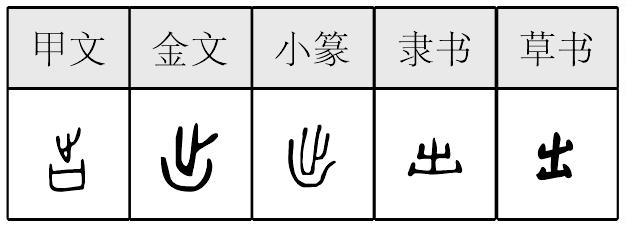 ❹丑态百出|按甲不出|舛讹百出|杜墙不出|鼓噪而出|和盘托出|呼之欲出|祸从口出|计将安出|计无所出|贱入贵出|匠心独出|量入为出|漏洞百出|谬误百出|旁见侧出|旁逸斜出|喷薄而出|破门而出|破绽百出|全盘托出|人才辈出|人材辈出|入不敷出|深藏简出|深居简出|深入浅出|水涸石出|水落石出|水清石出|挺身而出|脱口而出|脱颖而出|云开日出|政自己出 出出,甲骨文作  ,金文作  ,小篆作 。 自内而外曰 “出”,故字从止在凵 (古同 “坎”)上, 表示人的脚由坑坎向外邁出, 金文第一字形表意明顯。“凵”或作 “口”形,表意相同。由外出、出發義引申爲出現、出生、發生、取出、清除等義。卜辭多用本義,或用作人名。銘文多用本義。提示: 與“出” 義相反,“各”字所从之 “止”倒置,則表示由外向内,即抵達,表示這個意義的 “各”字後世作 “格”。 楚簡帛文作 ,易與“止”混。秦簡牘文作 ,古隸典型。參見107.各字條。 出chū甲骨文是会意字,由“屮”(chè)与“凵”(qiān,kǎn)合成。屮,甲骨文为脚趾,凵,为洞穴,表住所,离开住所谓之“出”。作意符生成的字有粜、朏、窋、祟等。“出”的另一读音为zhuó,实为“茁”之省。“句者毕出,萌者尽达”(《礼记·月令·季春》)之“出”即“茁”。茁,会意字。“草初生出地貌。”(《说文》)故作声符生成的字有: chu 上声:础(基础) 去声:绌(相形见绌) 黜(罢黜) zhuo 阴平:拙(弄巧成拙) 阳平:茁(茁壮) qū 屈(委屈) 相关链接 祟(suì,鬼鬼祟祟),会意字,相对“宗”而言。宗,从宀,从示,指的是屋子里或家里的鬼神。祟,从出,指的是孤魂野鬼。古人认为野鬼会给人带来灾祸。《说文》:“祟,神祸也。”祟,《集韵》:“雪律切。”与“出”的读音有点关系。“出”读如“曲”是方言也是古音。《集韵》:“尺律切。” 出 甲骨文; 金文; 篆chū[止(意符) + 凵(意符) →出(《説文》:“出,進也。象艸木益滋,上出達也。”許説不確。出,從裏面到外面〈出訪、初出茅廬〉;支付〈出力、出錢〉;離開〈出發〉;生長〈出产、出人才〉。甲骨文“出”從止從凵,像人從居處走開。許慎没有見過甲骨文,他的《説文解字》主要依據小篆,文字發展到小篆時,“ 出”字已經訛變不像,故有“象艸木益滋,上出達也”之説。其實甲骨文的出是“從止從凵(kǎn同坎)”,像人(止爲人足)走出住所(凵)。)] 出(chū)“ ,进也。象艸木益滋,上出达也。凡出之属皆从出。”(尺律切) 太炎先生云:“凡草木出本用出,不用茁。”[1] 甲骨文作 、 ,从止,从凵(坎),表示一只脚从门口或土坑口走出来。本义是外出,卜辞或用其本义,如“贞:于大甲告工方出”(《后》上29·4);卜辞中还有“出现”义,如“……出虹……于河,在十二月”(《前》7·43·2)。[2]金文作 、 、 等。金文中也用其本义,如颂簋:“颂拜 首,受令(命)册佩 (以)出,反(返)入(纳)堇(瑾)章(璋)。”[3]金文中又有出动、交出、发布等义。战国包山楚简作 、 ,望山楚简作 。到了睡虎地秦简作 ,已与现在字形完全一致了。孙诒让《名原·象形原始弟三》:“明古出字取足形出入之义,不象艸木上出形。盖亦秦篆之变易,而许君沿袭之也。”[4]许慎根据演变后的字形说解,并非原始构意。 出部有四个属字。如“敖”字下云:“游也。从出,从放。”“賣”字下云:“出物货也。从出,从買。” 出齣chū(5画)