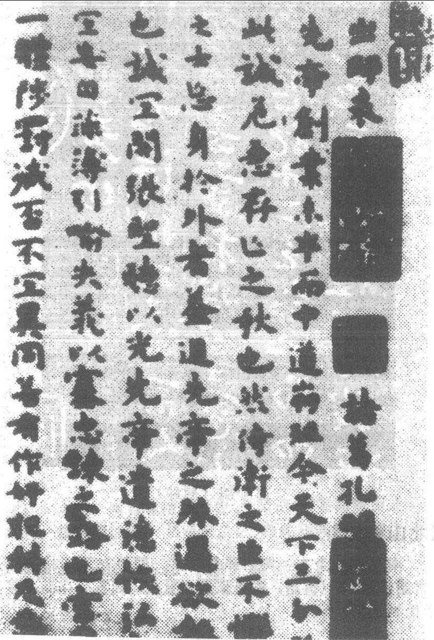 出師表 (局部) 明祝允明所書三國諸葛孔明之前、後兩表。為小楷六十六行,行二十數字之大作。末署:“正德甲戍四月十二日,華中甫過吴訪余,出示趙榮禄所畫 ‘武侯圖’。惜失後 ‘二表’,强余書此,真似煉石補天,恐不免識者之誚也。長洲祝允明識。”藉此知其來由。“甲戌”為明·正德九年(1514),允明時年五十五歲。字體高古,略含隸意,顯學鍾元常 (鍾繇)。為其代表作。早已流入日本,屬高島氏槐安居舊藏,今存東京博物館。 |