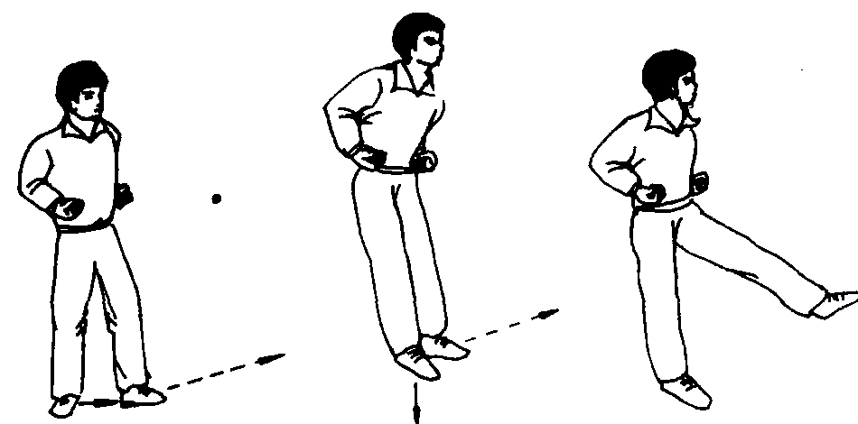 ☚ 飞步 小跨步 ☛ 击步 击步Jibu步法之一。是两脚前后开立,身体重心移至前腿,上体微前倾,后腿提起后前脚蹬地前纵,在空中以后脚内侧碰击前脚跟,随即后脚先落地的动作。
