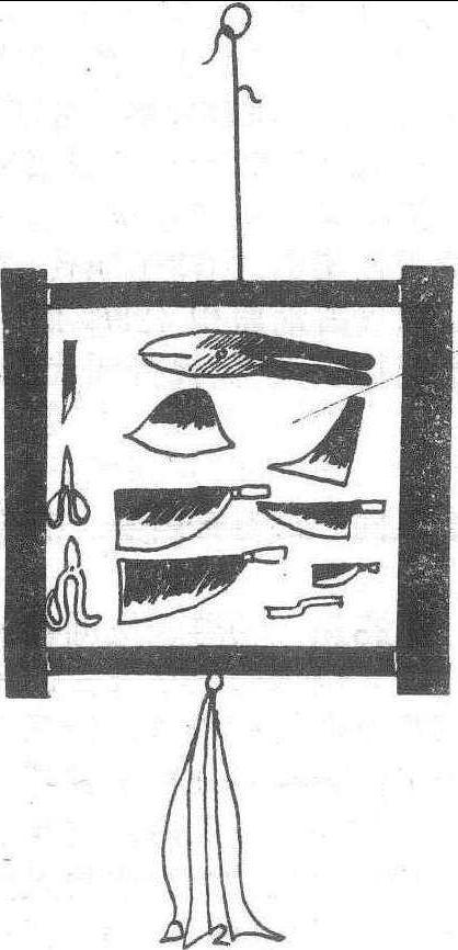 刀煎铺子幌,此幌为典型画幌,黑框内绘有蓝色的各种剪刀图案。示意出售各种剪刀。