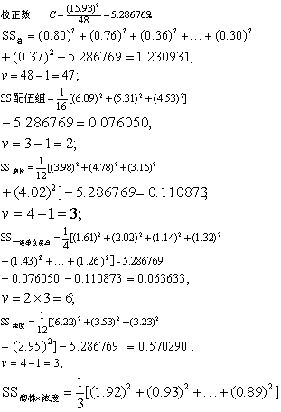 (2) 分别将总变异的离均差平方和及自由度分为六个部分。先按一级单位与二级单位分为两个部分,如表3。一级单位包括配伍组,一级处理(如瘤株),以及二者的交互作用(即一级单位误差);二级单位包括二级处理(如浓度),一级处理与二级处理的交互作用,配伍组与一级处理与二级处理的交互作用(即二级单位误差)。自由度与离均差平方和的计算公式可参见条目 “配伍组试验”及“析因试验”。计算配伍组、一级处理、二级处理三者中任一的离均差平方和时,用其余二者的“合计”如表1、2;自由度为“组数-1”。计算配伍组与一级处理、一级处理与二级处理的交互作用的离均差平方和时,用余者的“小计”,如表1、2; 自由度为二者自由度之积。二级单位误差等于总变异的离均差平方和减上述各部分的离均差平方和; 自由度亦为总变异的自由度减上述各部分的自由度的结果。
