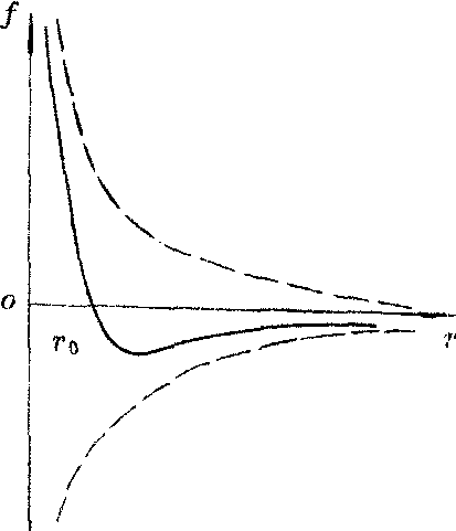 处,斥力和引力大小相等,合力为零,这个位置称为平衡位置。当r>r0时,分子间的相互作用表现为引力;当r0时为斥力。图中右上方的虚线是斥力随r变化的情况,右下方的虚线是引力随r变化的情况,实线是合力随r变化的情况。