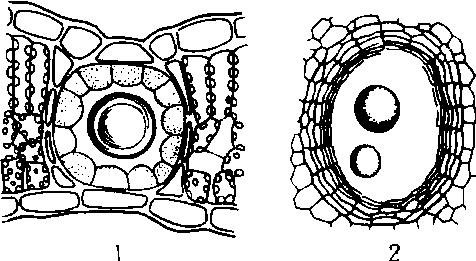 分泌腔 1.金丝桃叶中的裂生分泌腔 2. 柑橘属果皮中的溶生分泌腔 |