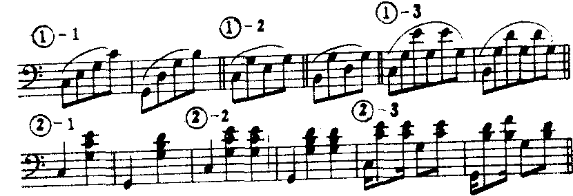 | 释义 | 分解和弦 分解和弦将和弦音作先后方式的呈现,称为分解和弦。其中和弦音按由低至高或由高至低顺序呈现的,又称琶音。在主调音乐中的伴奏部分,常用分解和弦来构成各种和声音型,以衬托主旋律声部。根据和弦音的不同分解方式,分解和弦音型大致可分如下两种类型: