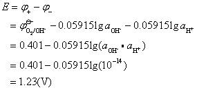 1.23V就是电解硫酸溶液时的理论分解电压(E理)。一些物质的实际分解电压E实和理论分解电压E理,见表。E实>E理,这是由电解时电极极化造成的。1mol·L-1电解质的分解电压 铂电极