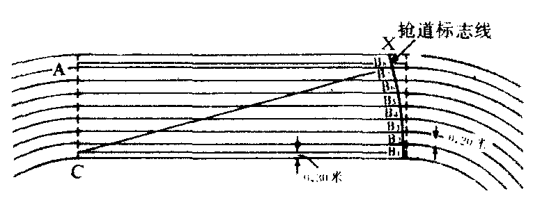 抢道标志线划法及切入差 侧分道线外缘0.20米。在前方的曲、直段分界线上(即200米起点处),按取B1点的方法取C点,然后以C点为圆心,以CB1(即直段长85.96米)为半径划弧线B1X,此弧线即为抢道标志线。在B1X弧线上各分道左侧分道线外缘0.20米处与B1Y线(曲、直段分界线)之间的距离,即为各分道的抢道切入差。计算切入差的方法是运用直角三角形的勾股弦定理计算的。按图上可得出下列公式: ,经计算800米跑各分道切入差见表。800米跑各分道切入差/p>