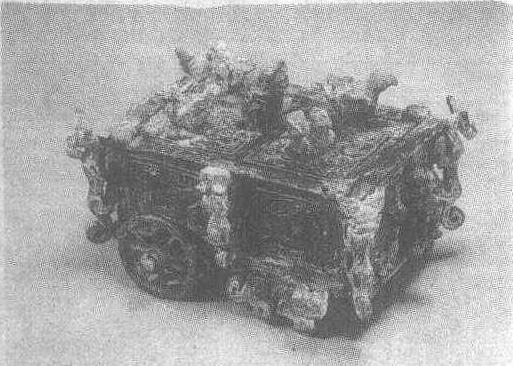 西周。通高9.1厘米,长13.7厘米,宽11.3厘米。山西省闻喜县上郭村出土。山西省考古研究所藏。挽车体呈长方形,既可牵动,又可推动,其中的四个小轮为虎踏车轮。两扇车门可开闭,其中一扇门上嵌一守门刖人,其腋下的门栓可控制车门的开闭。车箱盖亦可开合,拉手作成猴子形,四周立有四只可转动的小鸟,旋转灵活,可用于测风。车身满铸各种花纹,在底纹图案的衬托下,镶嵌着立体动物14个,表现的是畜养禽兽的“囿”。这件挽车的出土,映证了《周礼》记载的“刖者守囿”。刖人是指受了刖刑(锯掉人的脚)的人。整件挽车铸造精湛,能活动的部位多达15处,把苑囿场面与铜挽车结合在一起,表明了那个时代工匠的奇特构思,为研究我国奴隶社会的历史提供了十分珍贵的实物资料。