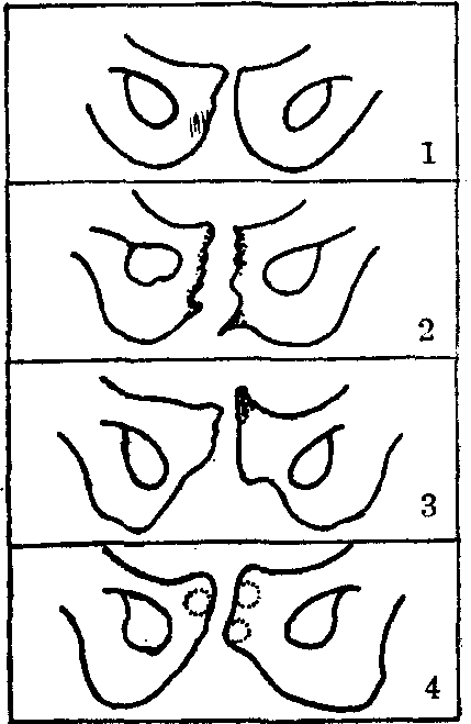 X线片早期多无改变,晚期可分为四型,即吸收型,吸收与增生混合型,增生型和囊变型(见图)。前两型系病变早期,症状多较活动,后两型为病变后期,症状多较稳定和轻微。吸收型: 耻骨下角或关节面有溶骨样吸收区,耻骨下角多呈新月状弧形缺损,关节面呈虫蚀样缺损,缺损边缘模糊不清。骨质增生或硬化不明显。混合型:耻骨下角或关节面骨质吸收,同时伴有骨质增生或硬化,有时可见有死骨样碎片附着在耻骨边缘。增生型: 耻骨上、下角或关节面有明显的骨质增生、硬化,可形成大小不等的骨赘,耻骨体有时明显膨大。囊变型:耻骨体明显膨大,骨质硬化,边缘有少许骨赘增生,体内有单个或多个囊变区。