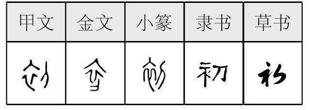 【提示】衤,5画,不要错写成4画的礻; 起笔是侧点,旧字形是竖点或横。 *初chū7画 衣部 (1) 开始;开始的阶段: ~春|~期|~步|年~。 (2) 第一个;第一次: ~伏|~一(农历每月第一天,等于说“第一个一”)|~稿|~试|~赛。 (3) 最低的: ~级|~等。 (4) 原来的;原来的情况: ~衷|~愿|和好如~。 初 ☚ 剡 前 ☛ 初chū甲骨文以来均从衣从刀会意,以做衣服先用刀来裁表示开始。用来表示时间、等级、次序等在前的。如:初一|初伏|初稿|初学|初等。引申为原来的,原来的情况。如:初衷|和好如初。 初★常◎常